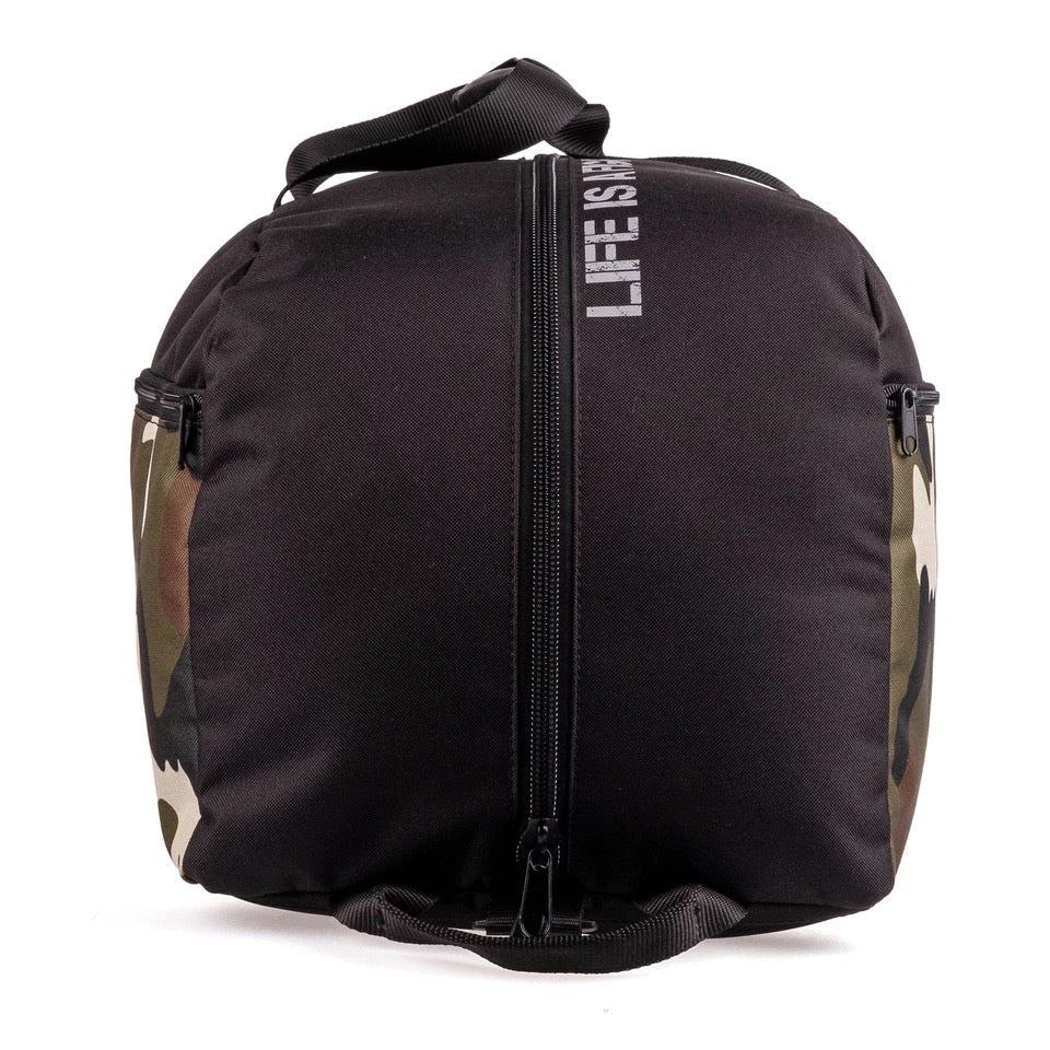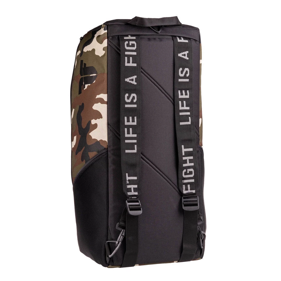 The Fighter “Camo” universal sports bag is made in the Czech Republic. The material is waterproof polyester. The bag has two side pockets on each side. You can find more pockets inside. The bag can be carried in the hand, over the shoulder and as a backpack. The back straps are in a hidden pocket at the bottom of the bag. The bottom of the bag is padded. There is enough room for carrying all necessary equipment for your training.Â