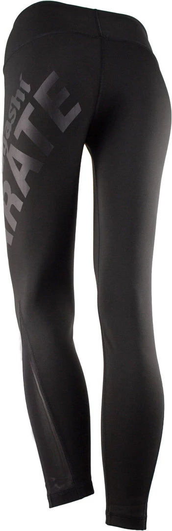 The black women’s leggings “Raven” by Hayashi are ideal performance pants made of highly elastic functional fabric and a must-have for active women. The breathable fabric clings softly and yet unfolds its strong support function. During sports activities “Raven” increases your muscle work and leads to improved metabolism. For even better comfort provide airy mesh inserts, which run wedge-shaped from the knee to the leg. The highlight, however, is the approximately 10 cm wide waistband, which is double-layered made of the same elastic material. For the optical stretching of your legs, the rubberized Hayashi Company print runs diagonally across the left trouser leg from the butt to the knee. As a combination wonder “Raven” surprised to smart sports top, as well as casual streetwear to a long shirt and ankle boots.